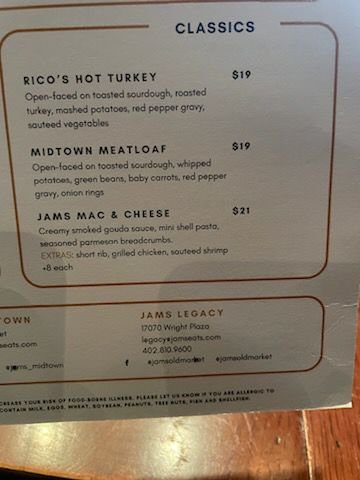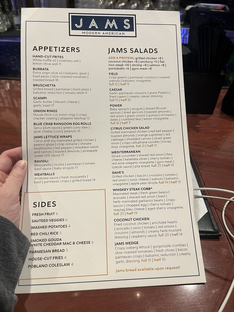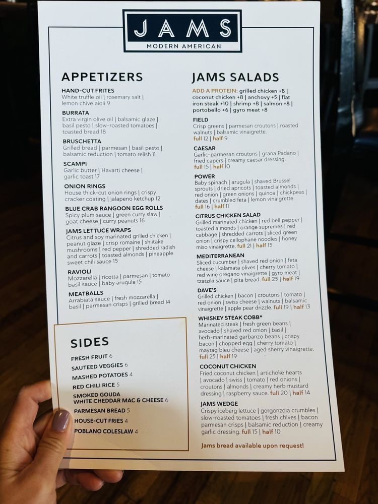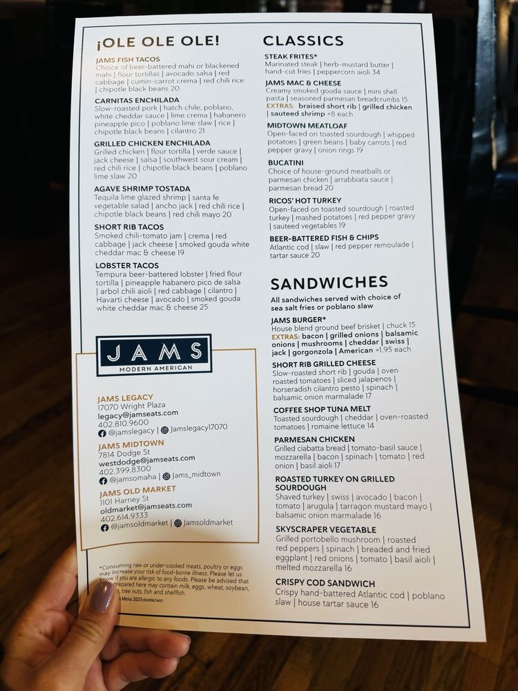 Jams Old Market offers a diverse menu of American, seafood, and salad options in Omaha, NE. Their appetizers, like Handcut Frites and Blue Crab Rangoon Egg Rolls, stand out for their unique flavors and quality. The salads, including Coconut Chicken Salad and Whiskey Steak Cobb, provide satisfying and filling options. For a taste of Ole Ole Ole, try the Grilled Chicken Enchilada or the Lobster Tacos. Customers praise the open atmosphere and excellent service, making it a favorite spot for groups. Standout dishes like the bruschetta and meatballs keep patrons coming back. With generous portions and a vibrant ambiance, Jams Old Market is a must-visit for those looking for a casual yet classy dining experience.